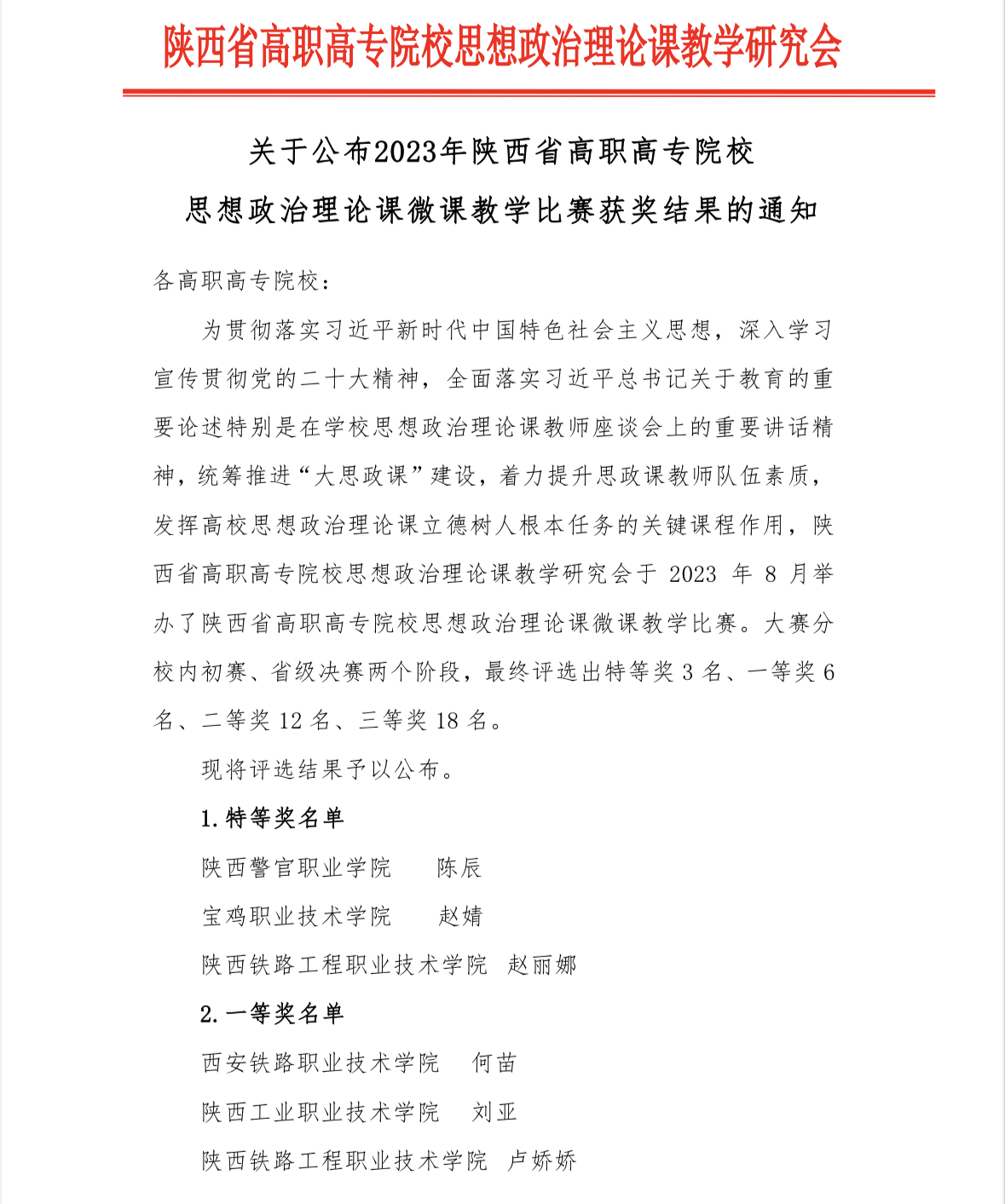 近日,在2023 年陕西省高职高专院校思想政治理论课微课教学比赛中,我院教师刘亚荣获一等奖。