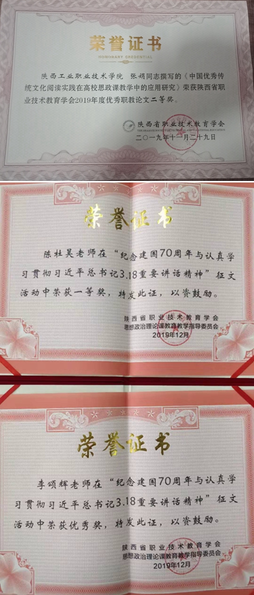 根据陕西省职教学会近日公布的“2019年度优秀职教论文”和“庆祝新中国成立70周年与认真学习贯彻习近平总书记3.18重要讲话精神主题征文”评选结果,马克思主义学院张娟老师的《中国优秀传统文化阅读实践在高校思政课教学中的应用研究》荣获职教学会年度优秀职教论文评选二等奖;陈杜昊老师的《新时代高校思想政治理论课中现代信息技术的应用规范研究》荣获职教学会思政课教指委征文活动一等奖,李颂辉老师的《高职思政课教学转型创新的理论思考与实践探索》获优秀奖。