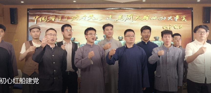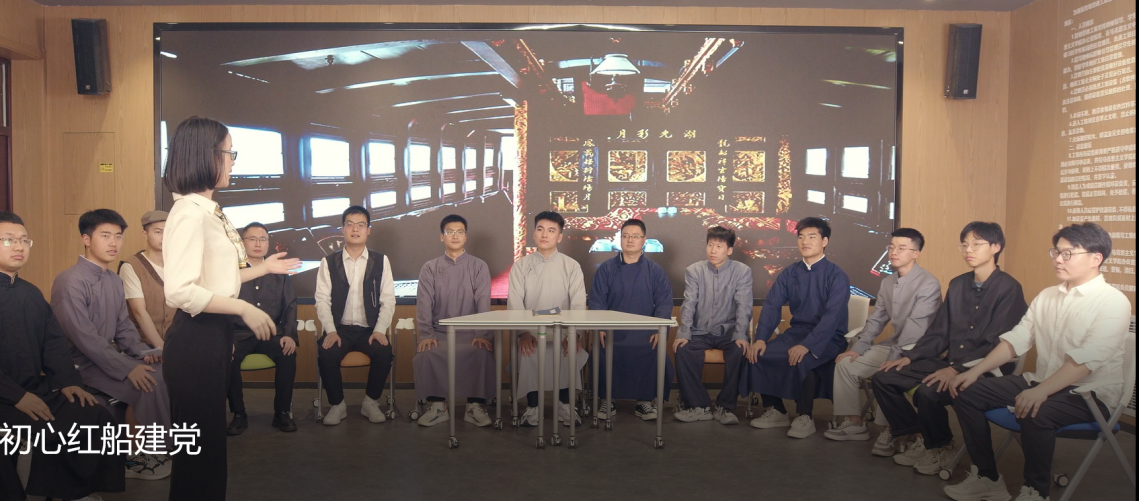 2021年8月,为了庆祝中国共产党成立100周年,同时进一步提升思政课的育人效果,理论联系实际,马克思主义学院师生共同策划、倾心指导、全员参与,借助百年前红船上的中共一大为根据,以毛泽东等13位一大参会代表为原型,在中国共产党成立100周年之际,创立了一部红色思政微剧《初心--红船建党》(图9、图10)。“今天,中国共产党在这艘红船上成立了,这是中国革命开天辟地的大事变”、“吾辈愿为共产主义奉献终身”等台词,让师生们身临其境,感受一大代表们的满腔热血和崇高理想。