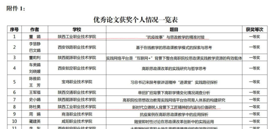 根据陕西省职教学会近日公布的思想政治理论课教育教学指导委员会征文评选结果,在“贯彻习近平来陕考察讲话精神,推进新时代高职思政课改革创新”主题征文活动中,我院马克思主义学院董娟老师的《“抗疫故事”与思政教学的精准对接》和陈杜昊老师的《新时代立德树人背景下工匠精神的内涵与价值研究》分别荣获主题征文活动一等奖;陈晨老师的《“互联网+思政教育”模式的创新和实践》和张娟老师的《职业素养教育嵌入高职院校思政课的探究》分别荣获二等奖;我院获评主题征文活动优秀组织奖。