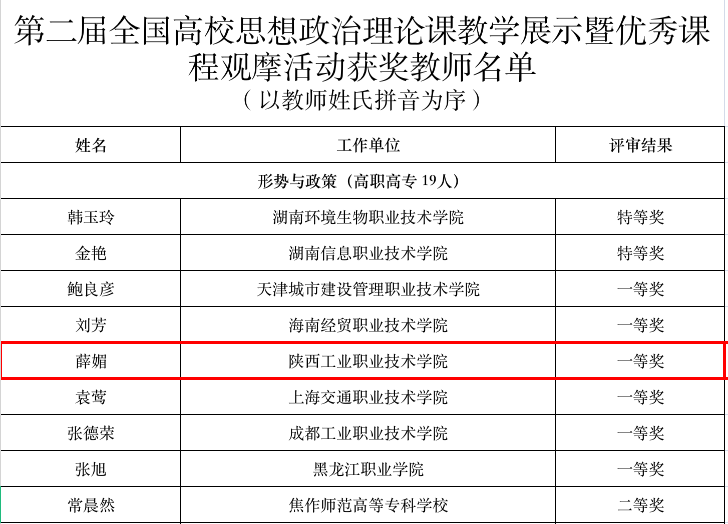 近日,教育部社会科学司公布了第二届全国高校思想政治理论课教学展示暨优秀课程观摩活动评审结果,我校教师薛媚斩获高职组《形势与政策》课程展示一等奖,创我校参加本项赛事所获奖项新高,充分展现了我校近年来思想政治理论课改革建设成果。