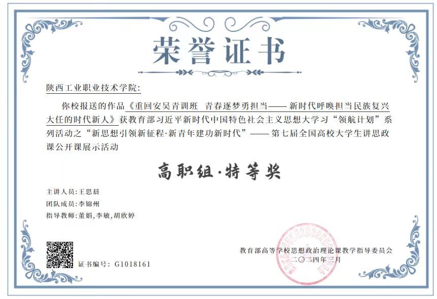 日前,由教育部高校思想政治理论课教学指导委员会主办、南开大学马克思主义学院承办的“新思想引领新征程·新青年建功新时代”——第七届全国高校大学生讲思政课公开课展示活动评选结果揭晓,我校作品《重回安吴青训班 青春逐梦勇担当——新时代呼唤担当民族复兴大任的时代新人》荣获高职组特等奖。