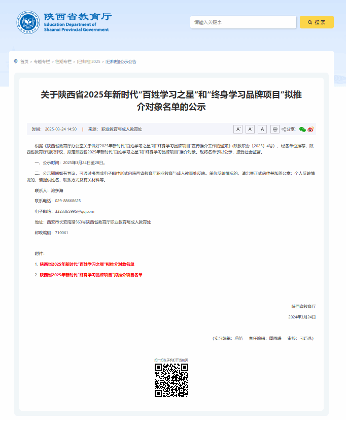 近日,根据中国成人教育协会《关于做好2025年新时代“百姓学习之星”和“终身学习品牌项目”宣传推介工作的通知》(中成协〔2025〕4号)要求,陕西省教育厅公布了2025年新时代“百姓学习之星”和“终身学习品牌项目”推介名单,我校马克思主义学院报送的“秦马健康教育”项目成功入选陕西省2025年新时代“终身学习品牌项目”。