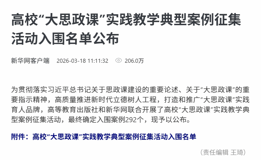 近日,由高等教育出版社与新华网联合组织开展的全国高校“大思政课”实践教学典型案例征集活动评选结果揭晓,我校马克思主义学院申报的《融合“学创”双规,推动思政课实践教学深走实》实践教学案例成功入选,充分展现了学校在思政课改革创新与实践育人方面的扎实成效。